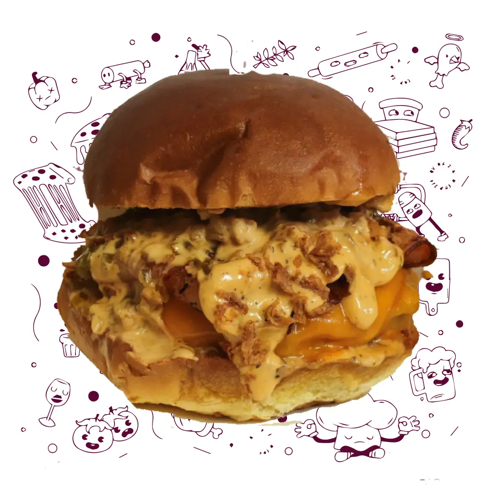 Pan Brioche, Carne de Ternera 140 gr, Queso Cheddar (Doble), Bacon, Relish de Pepinillos, Cebolla Crujiente, Salsa Mayo Ahumada